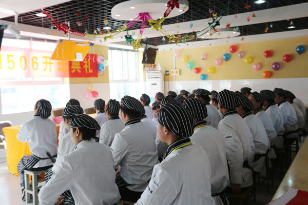 ,全体同学作庄严宣誓:热爱烹饪事业,弘扬饮食文化;尊师重道守纪,恪守诚信公德;维护食品安全,倡导勤俭节约;立一等品格,练一等技能,为做一名德艺双馨的厨师而奋斗!。
