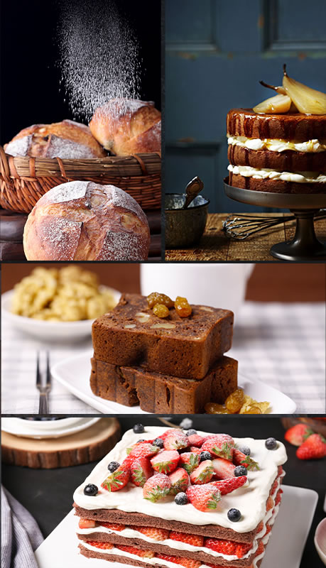 单层蛋糕、单层蛋糕整体设计(花卉摆放、动物制作)、双层蛋糕、双层蛋糕整体设计(花卉摆放、整体构图搭配)、树根裱花蛋糕、慕斯糊调制、形状制作、巧克力插片、水果拼摆、欧式水果蛋糕、果膏技法、水果拼摆、小包酥类:苏式月饼、老婆饼、肉松饼海绵蛋糕、慕思蛋糕杯、葡萄干瑞士卷、双色蛋糕卷、天使蛋糕、虎皮蛋糕、香橙蛋糕、牛油蛋糕、枣泥蛋糕、原味戚风蛋糕、果味戚风蛋糕、肉松戚风蛋糕、香蕉蛋糕、小纸杯蛋糕、时令水果蛋糕、菠萝皮面包、肉松卷面包、豆沙牛角面包、丹麦牛角包、丹麦风车面包、丹麦秋叶面包、吐司面包、法国长棍面包、汉堡包、蝴蝶酥、三角千层酥、芝麻酥条、桃酥、香葱曲奇、奶油曲奇、蛋挞、水果挞等 。